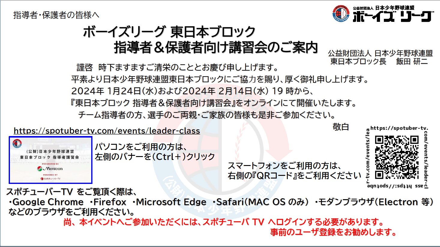 ボーイズリーグ東日本ブロック 指導者&保護者向け講習会のご案内