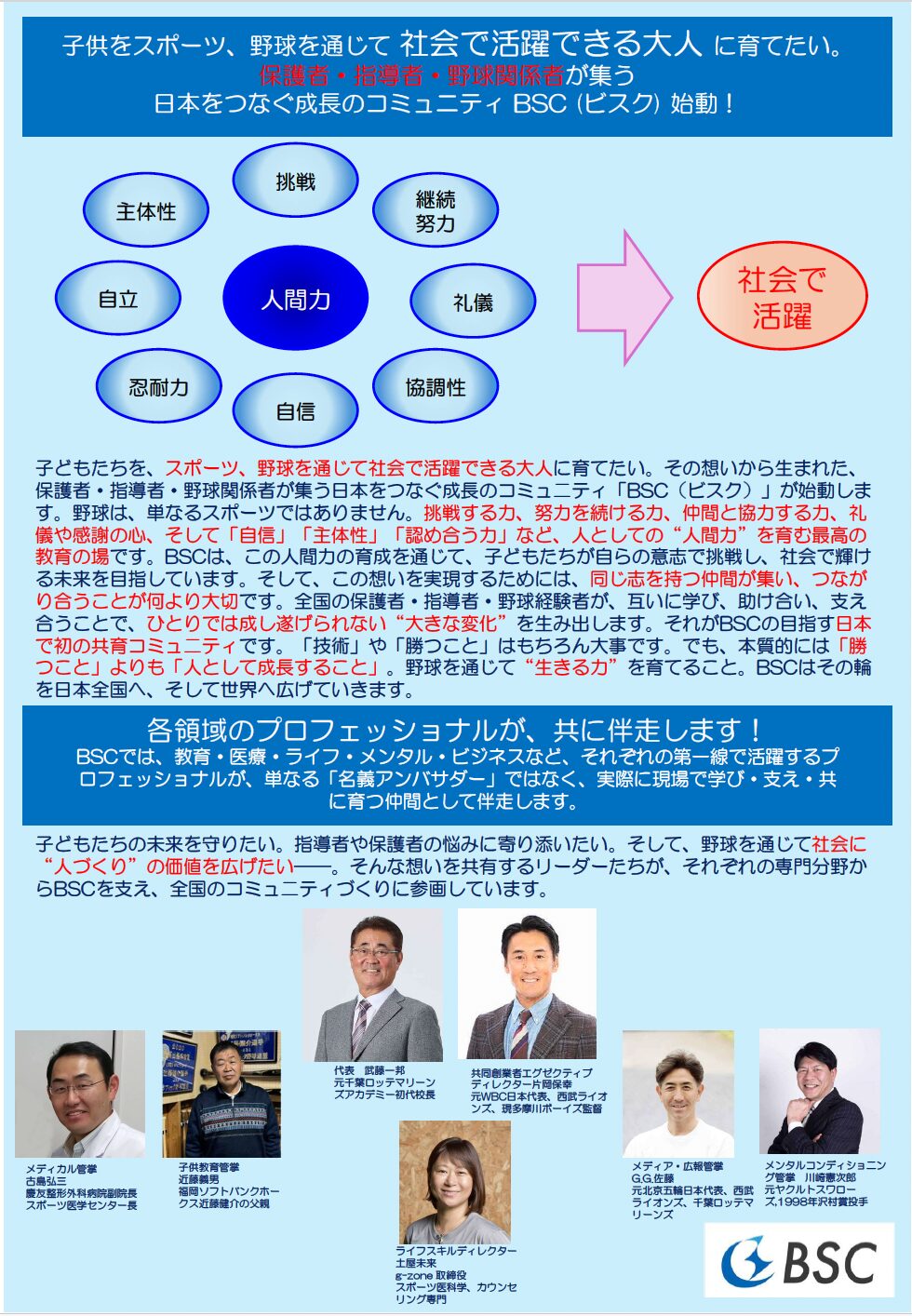 「BSC(ビスク)」とは、子どもたちの未来を守りたい、指導者や保護者の悩みに寄り添いたい、そして野球を通じて社会に“人づくり”の価値を広げたい。
