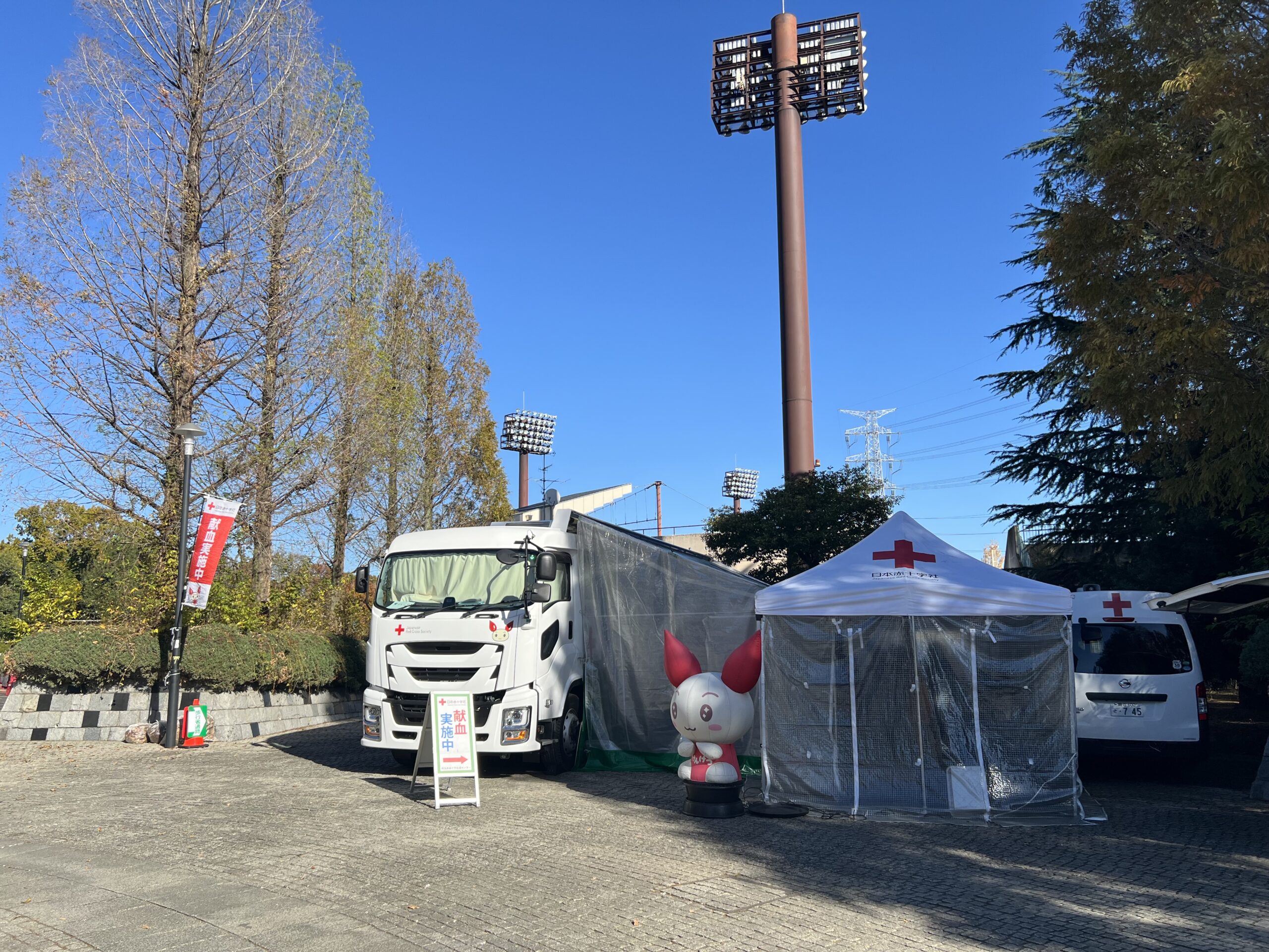 日本赤十字社・埼玉県赤十字血液センターの協力により、早朝よりスタジアム前広場に献血車が設置され、