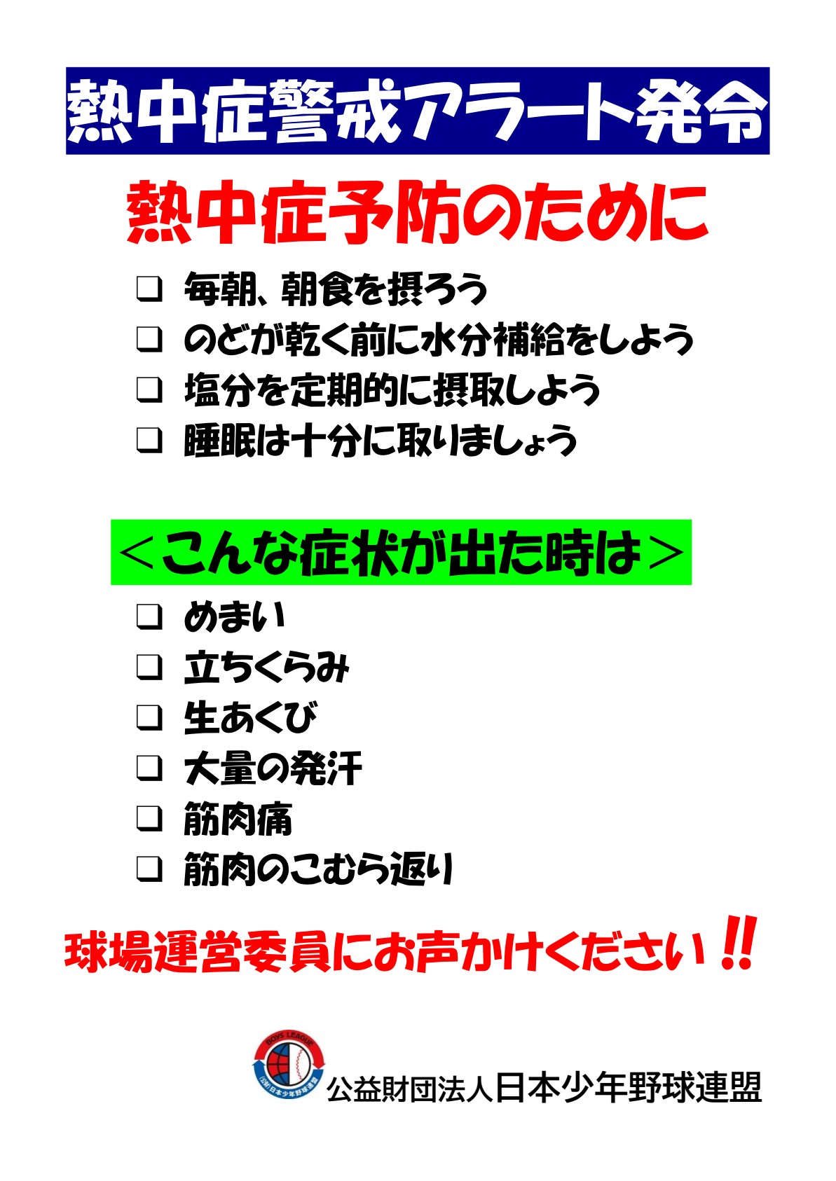 熱中症対策について、改めて各チームに周知をお願いいたします。