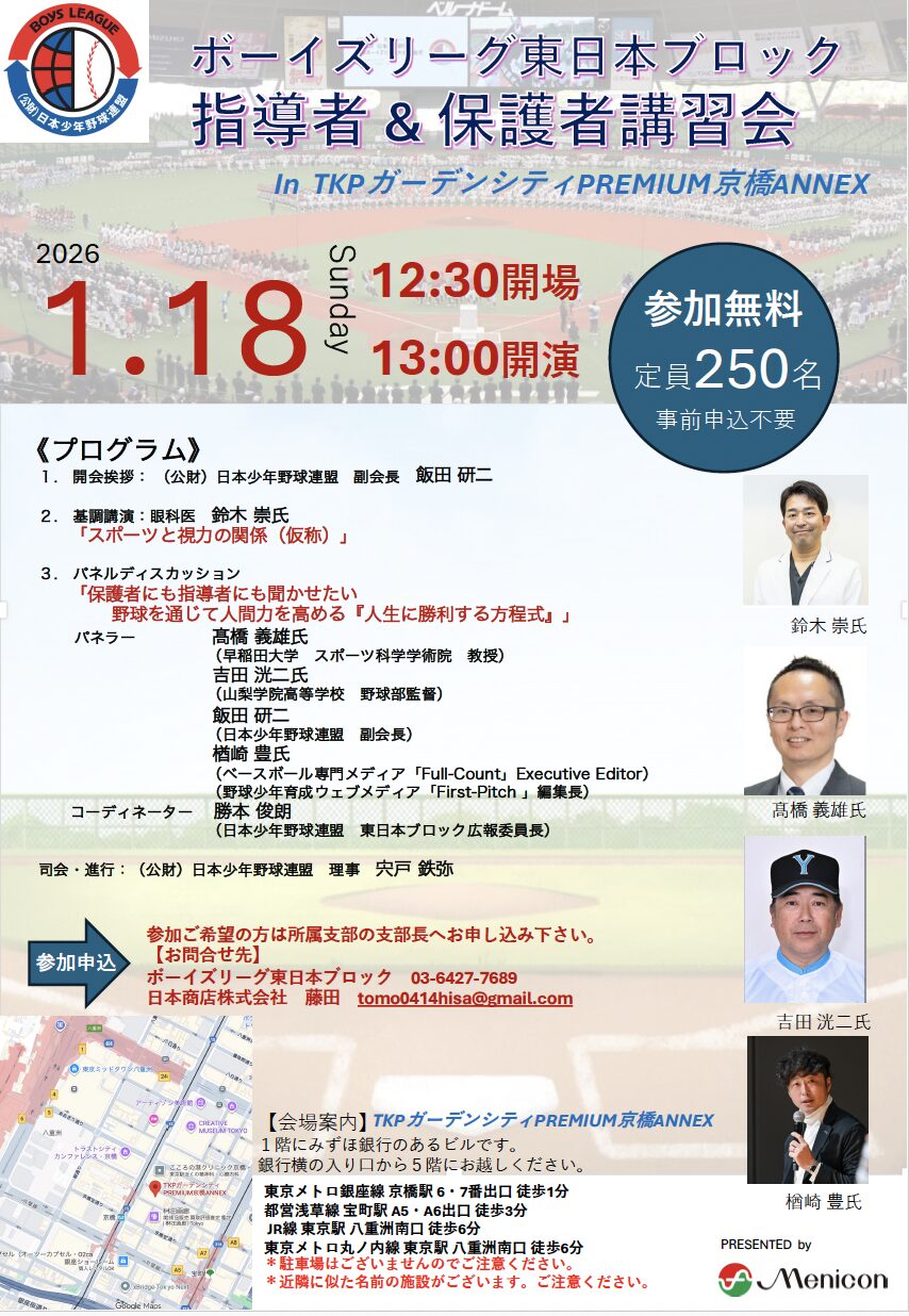 1月18日(日)の13時より、「ボーイズリーグ東日本ブロック 指導者&保護者向け講習会」が開催されます。