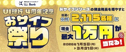 抽選で合計2,115名様に現金が最大1万円当たる「UI銀行4周年記念 おサイフ祭り」を実施中です!