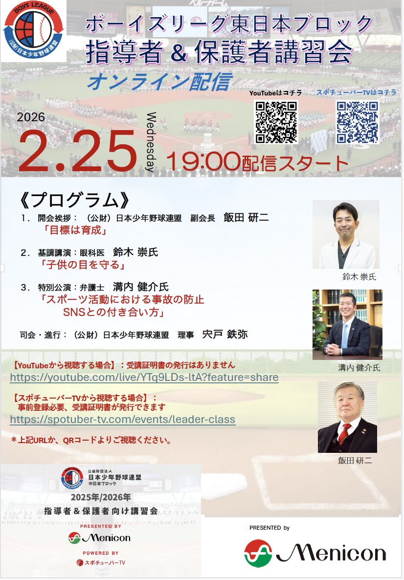 2026年2月25日(水)19時より、「ボーイズリーグ東日本ブロック 指導者&保護者向け講習会」が開催されます。