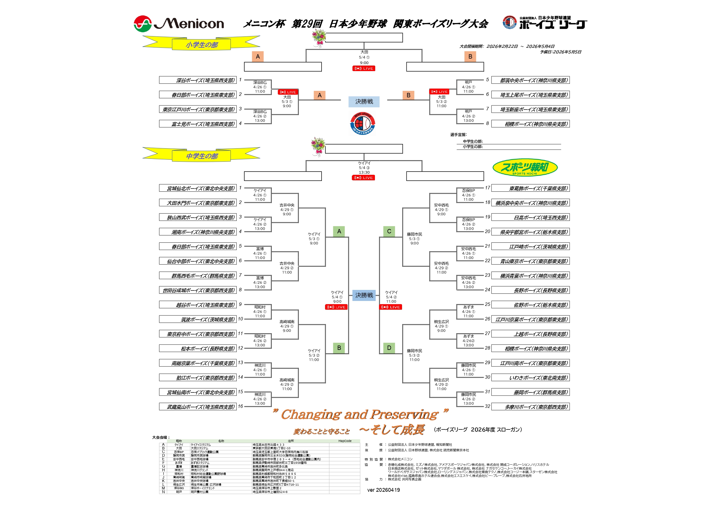 【お知らせ】メニコン杯 第29回 日本少年野球 関東ボーイズリーグ大会 決勝トーナメント組合せ