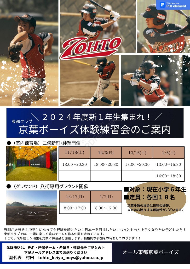 東都クラブ京葉ボーイズは、中学生になっても野球を続けたいと考えている小学校6年生を対象に
