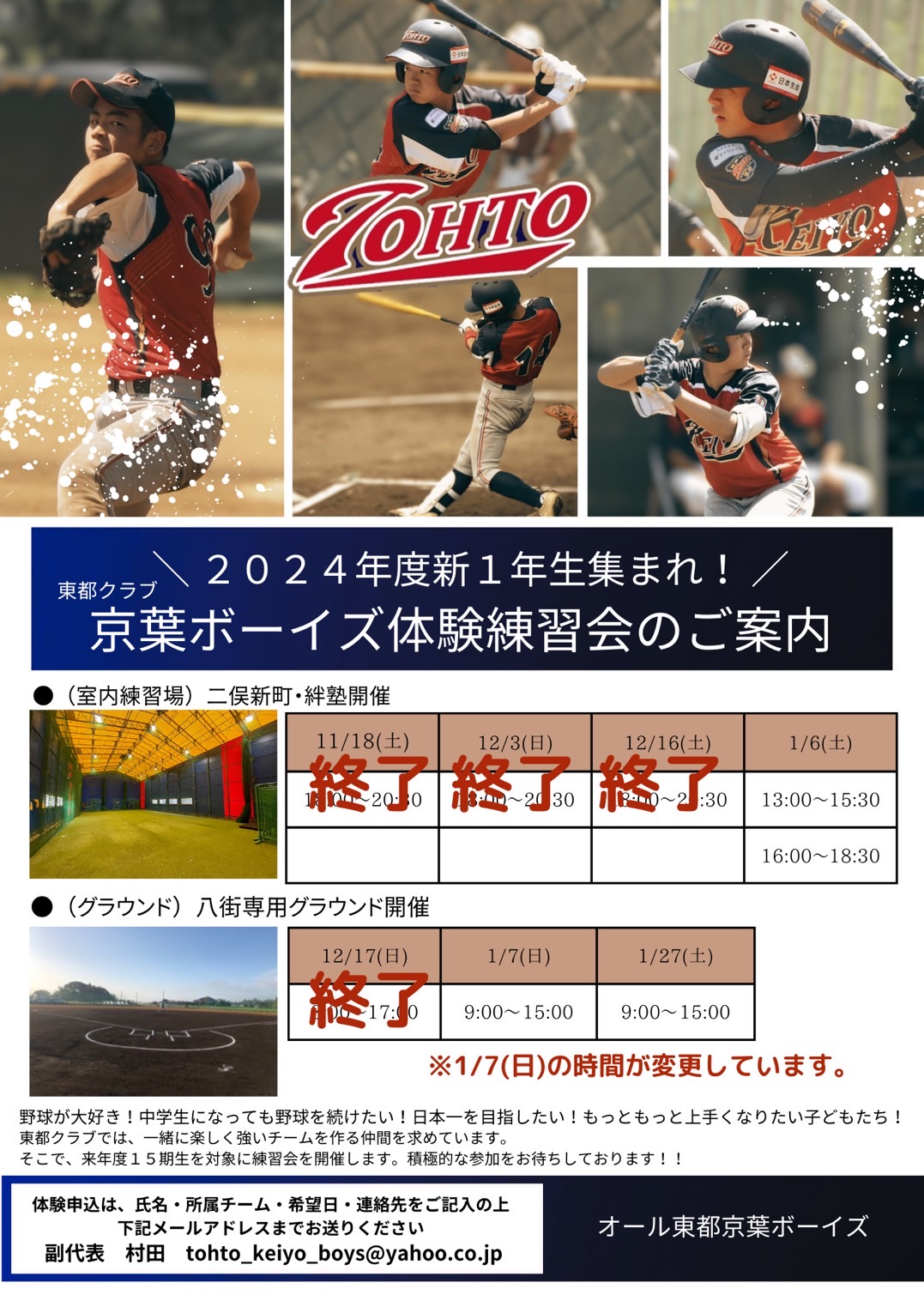 6年生対象の体験練習会につきまして、1/7八街グラウンドの募集枠が定員オーバーになり締め切りました。