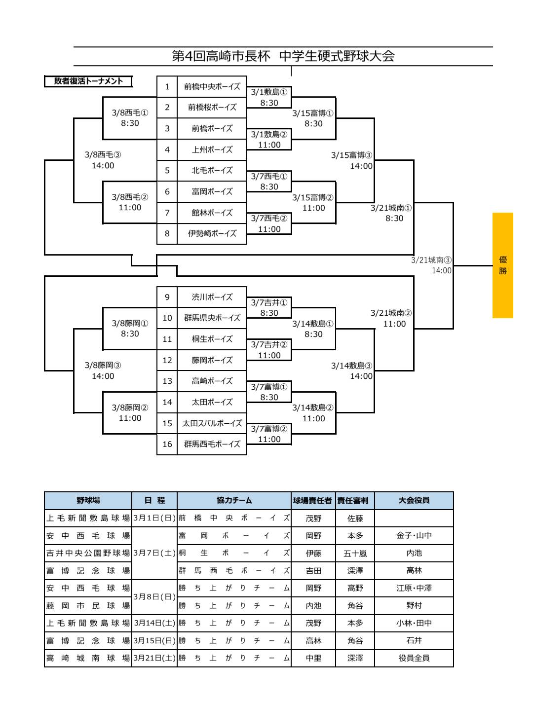 【組合せ】第4回高崎市長杯 中学生硬式野球大会