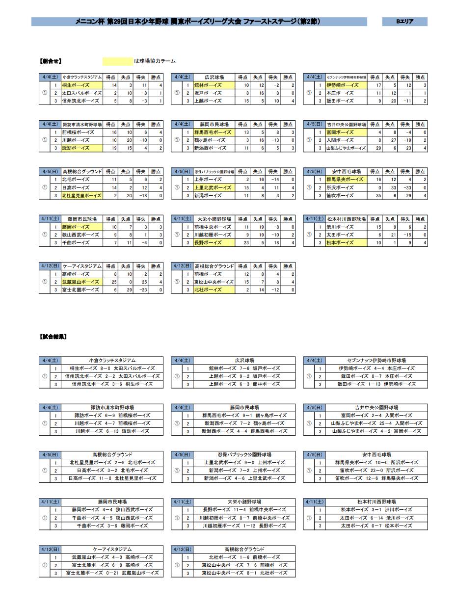 【第二節結果】メニコン杯 日本少年野球 関東ボーイズリーグ大会 Bエリア結果