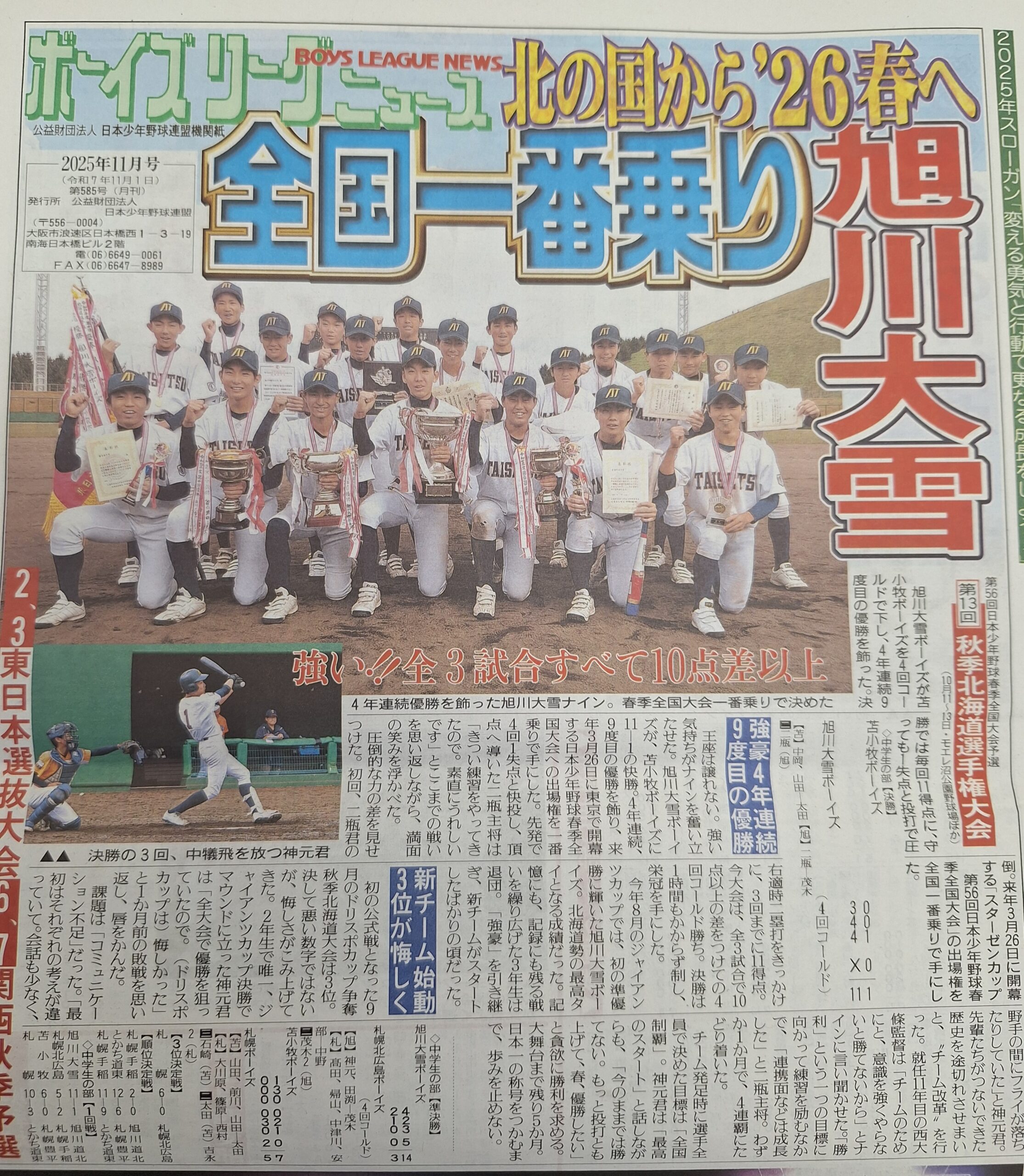 旭川大雪ボーイズが4年連続9度目の春季全国大会への出場を決めた。 8月にはジャイアンツカップで決勝に進出した。チームの目標「全国制覇」にむけて、チーム一丸!