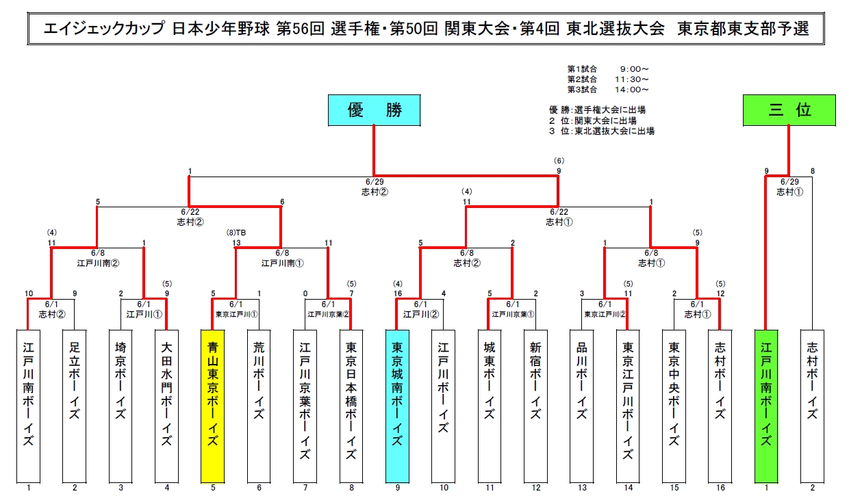 エイジェックカップ 日本少年野球 第56回選手権大会・第50回関東大会・第4回東北選抜大会 東京都東支部予選の三位決定戦、決勝戦が志村ボーイズグラウンドにて行われ、全国へむけた熱い戦いが繰り広げられました