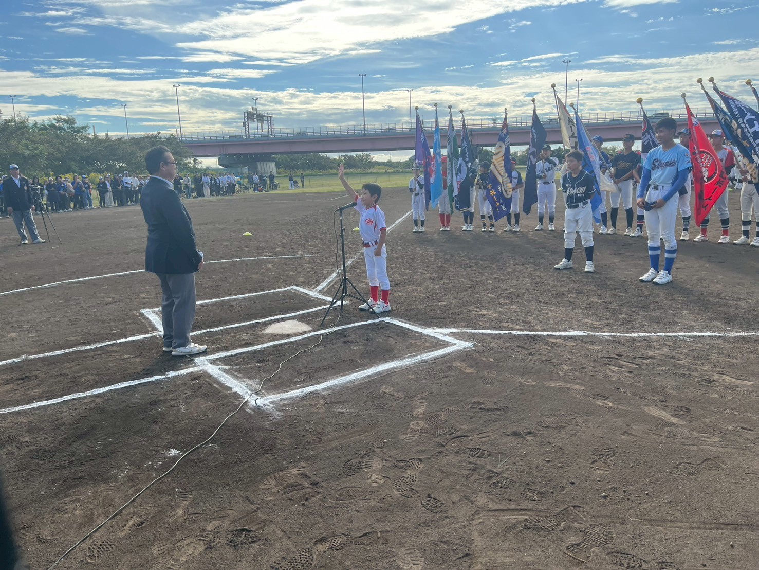 選手宣誓は、中学生の部・品川ボーイズ主将の西村絆(にしむら・きずな)君、小学生の部・東京足立ボーイズ主将の柳凌駕(やなぎ・りょうが)君、ティーボールの部・荒川・流山合同ボーイズ(荒川ボーイズ)小嶋宏樹(こじま・ひろき)君の3名が務め、力強く素晴らしい宣誓を行いました。
