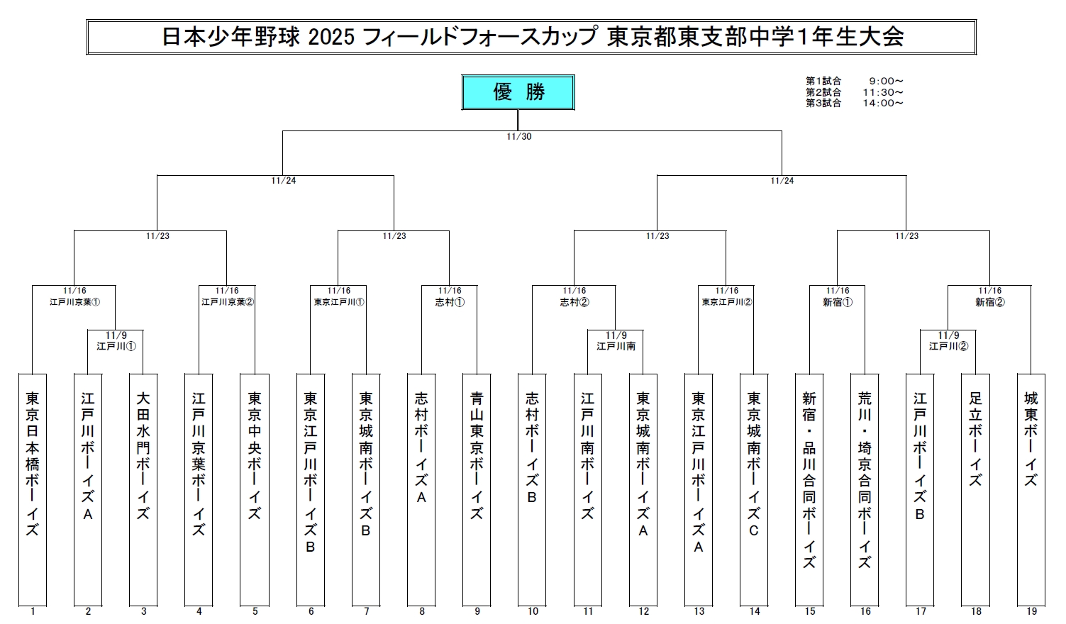 日本少年野球 2025 フィールドフォースカップ 東京都東支部中学1年生大会の組み合わせが決定しました。