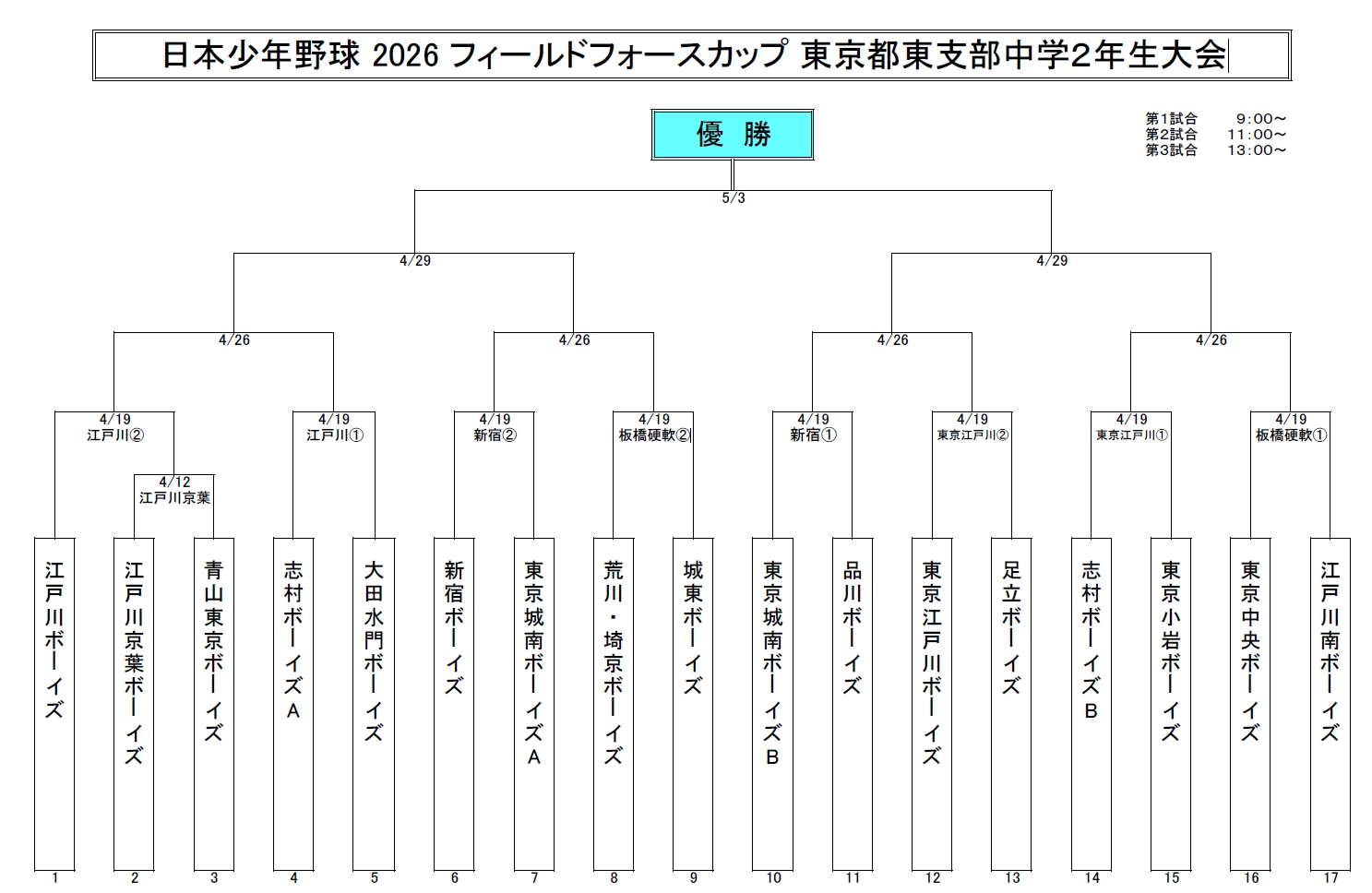 日本少年野球 2026 フィールドフォースカップ 東京都東支部中学2年生大会の組み合わせが決定いたしました。
