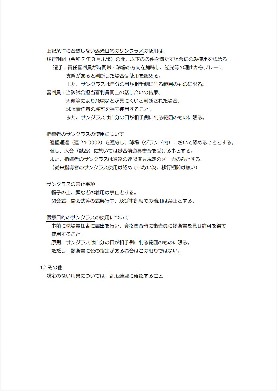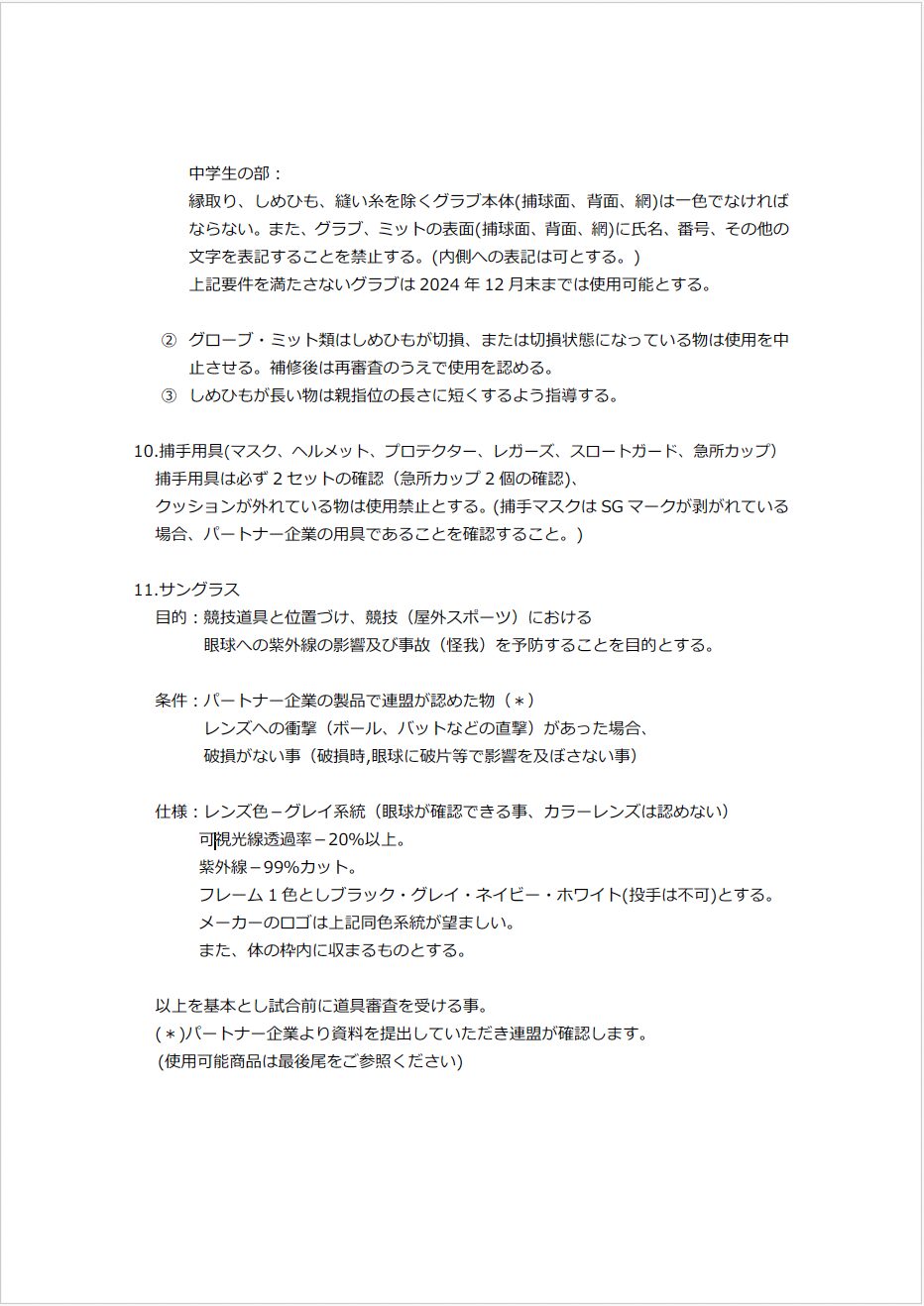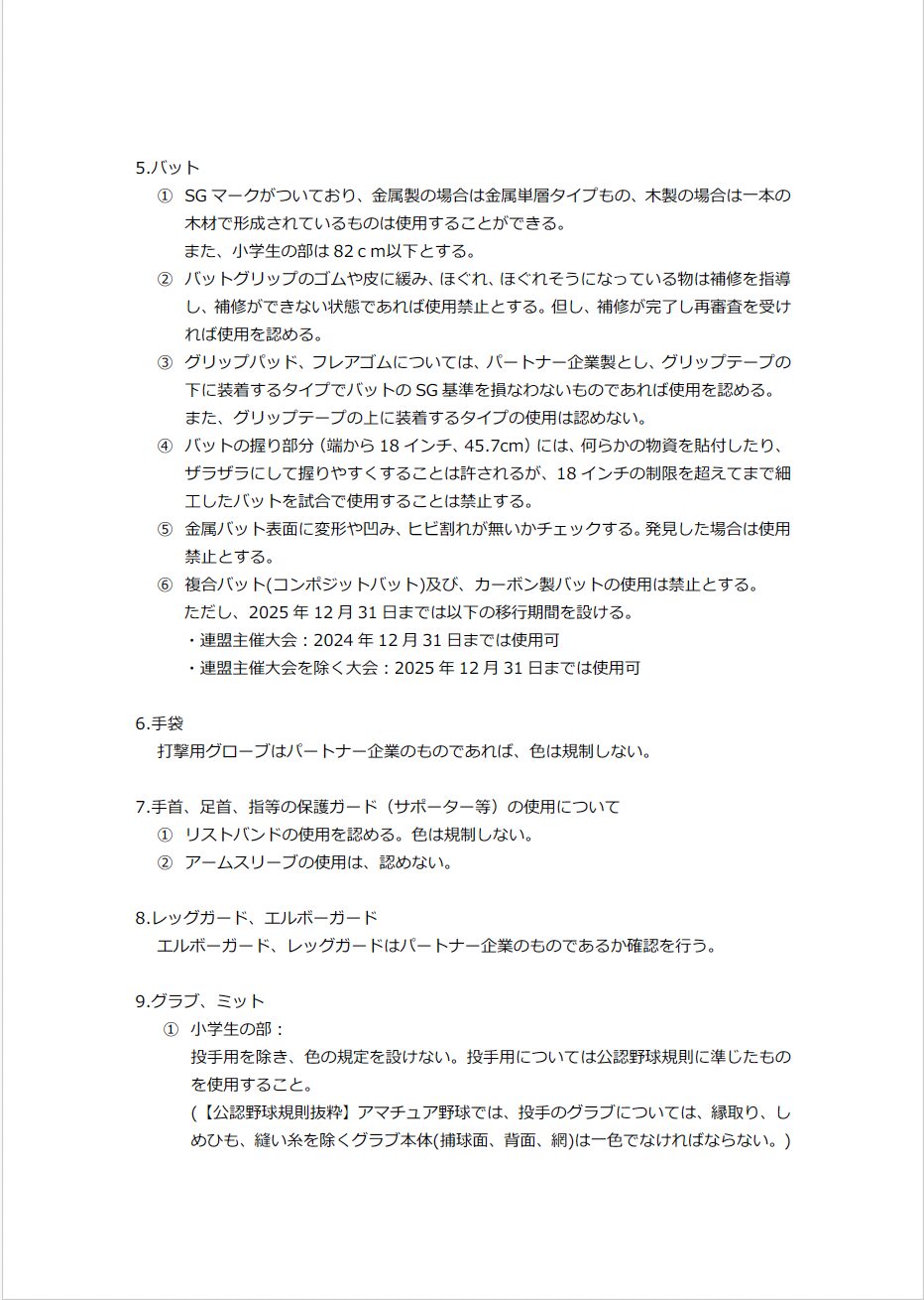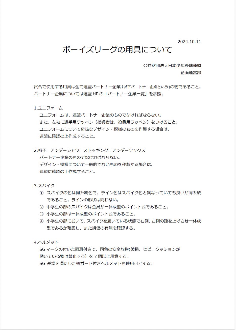 日本少年野球連盟本部より、試合で使用する用具について、案内が来ております。